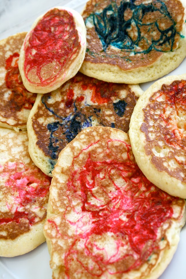 With that said, weekends like these always include a special breakfast...So my partner in crime helped me make swirls of color in our cornmeal yogurt pancakes. I'm pretty sure we go through food dye around here like nobodies business... :-)